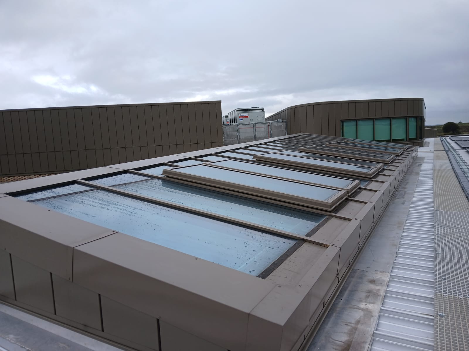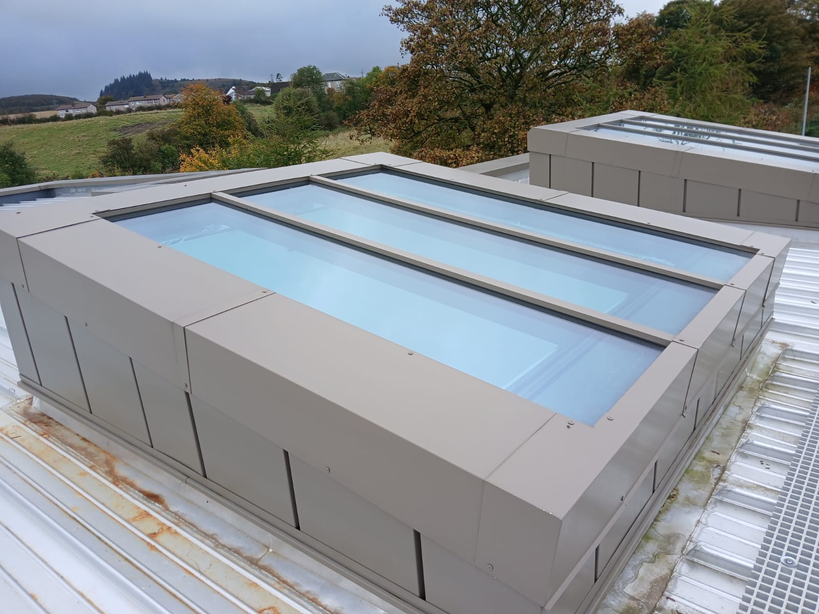 Various TN66/67 Class ‘1’ Non Fragile Specification Monopitch Rooflights glazed with Neutral Solar Control Safety Glass and Electronic opening Windows to the 2 Large Units. All Rooflights installed by BBS Structural Glazing Ltd To Prepared Steel By Others.